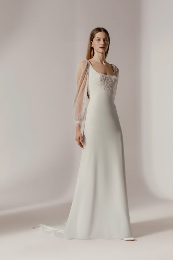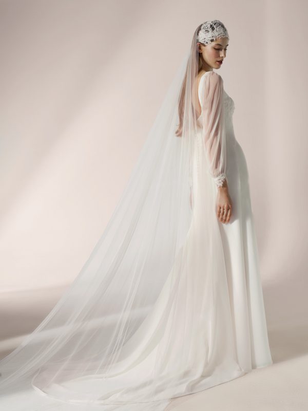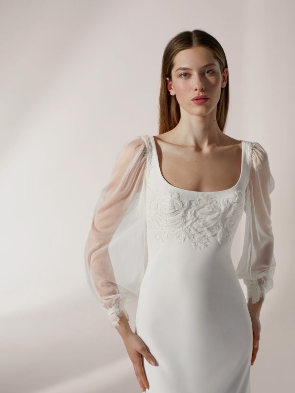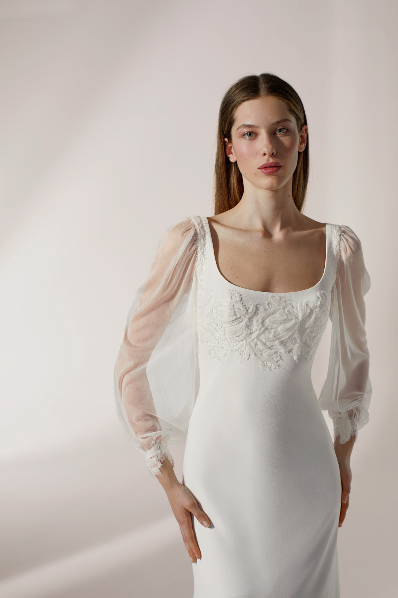 Vestido de línea en gasa georgette mangas en tul de seda y puntilla de tul con mano seca.