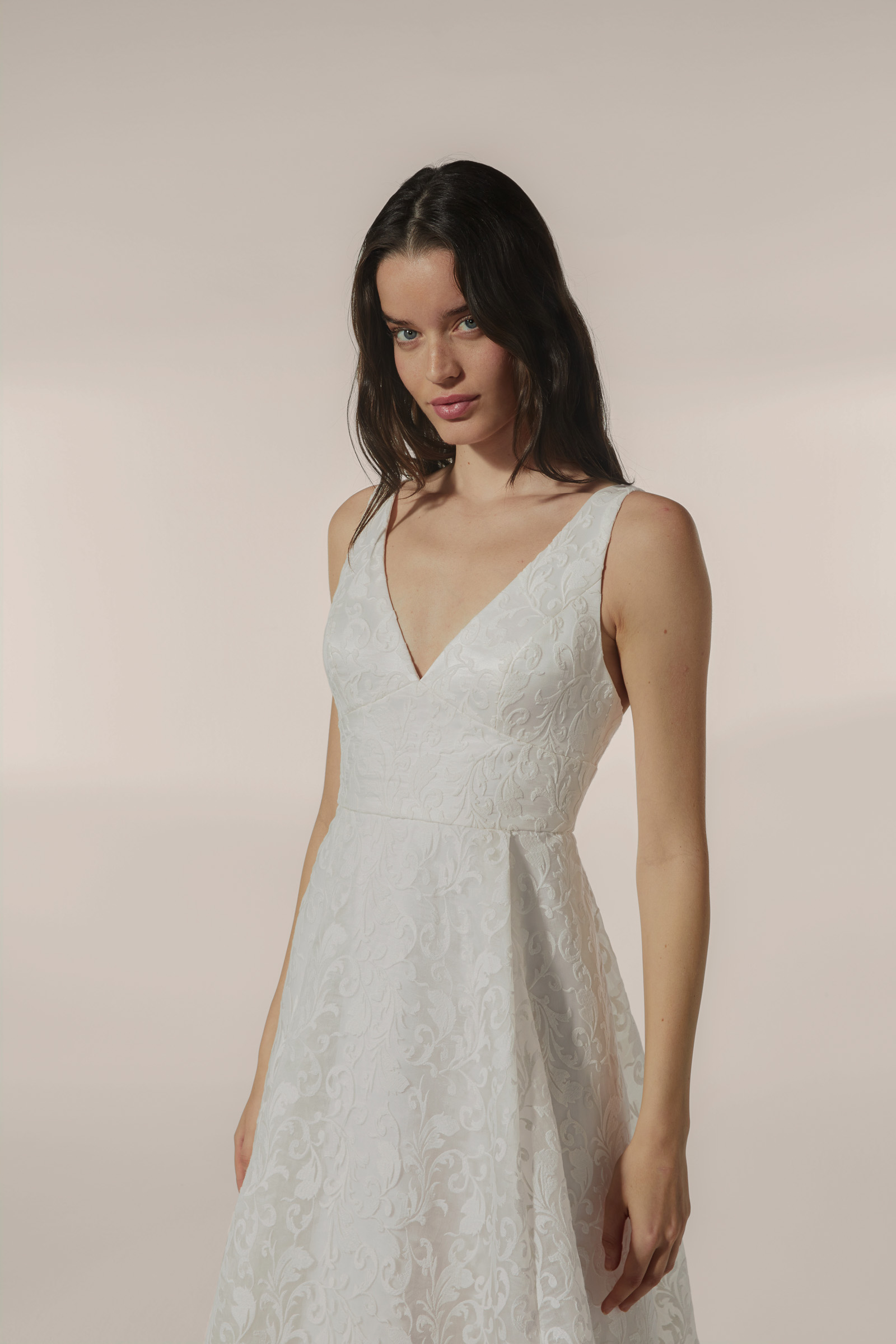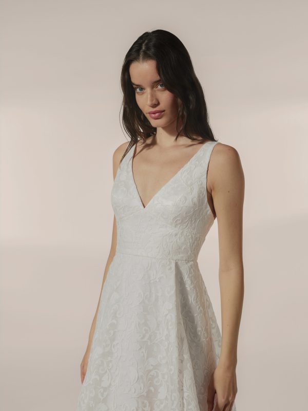 Vestido línea evasé con combinación de escotes pico. Realizado en organza bordada, juego de transparencia en falda.