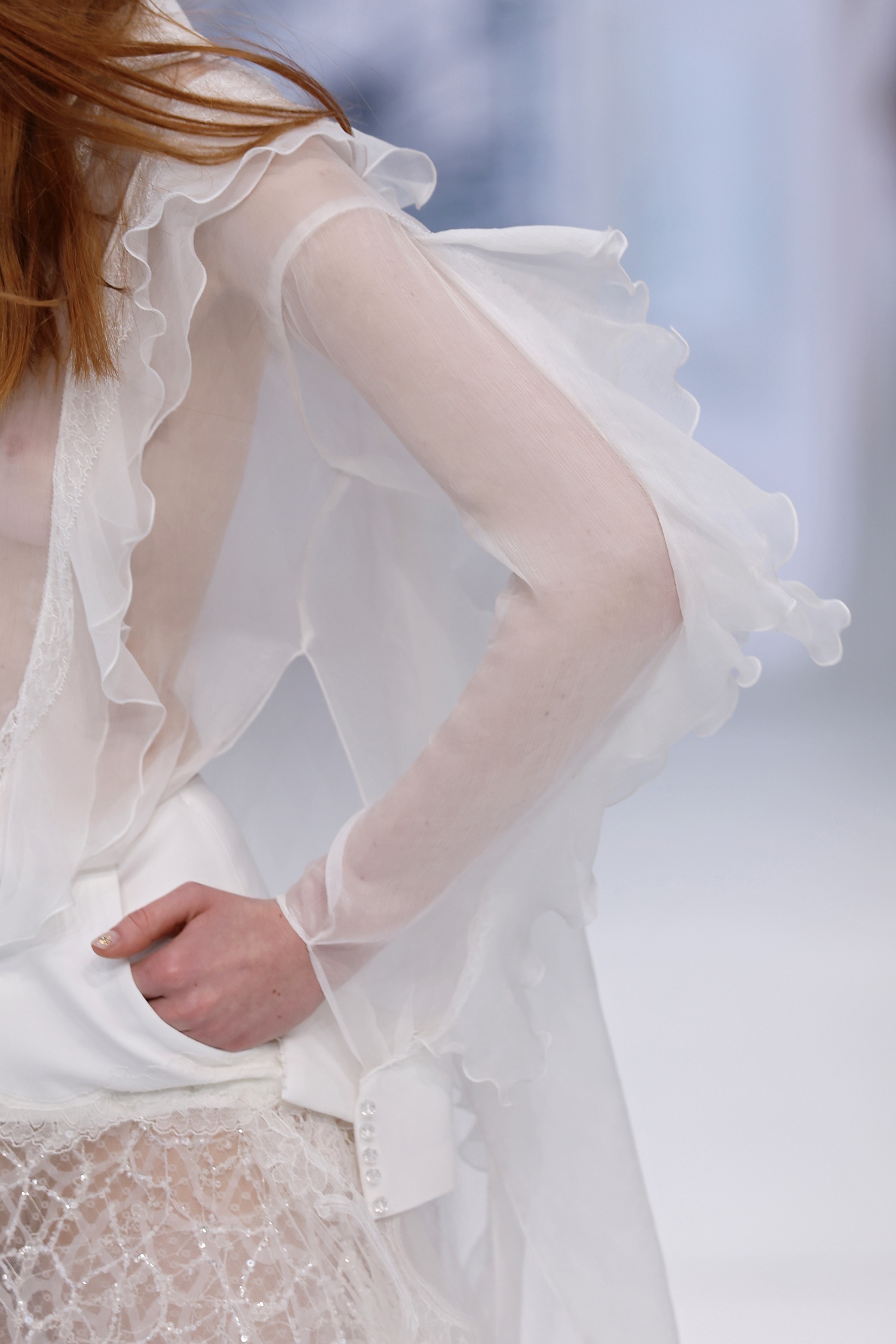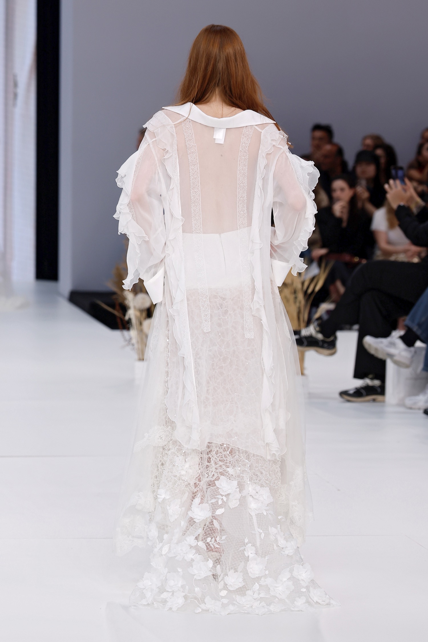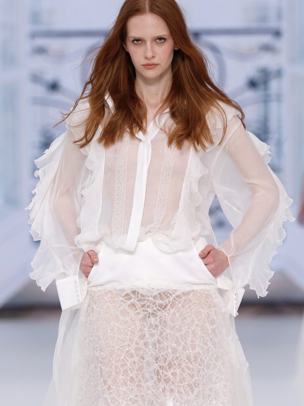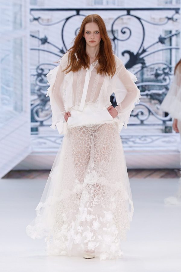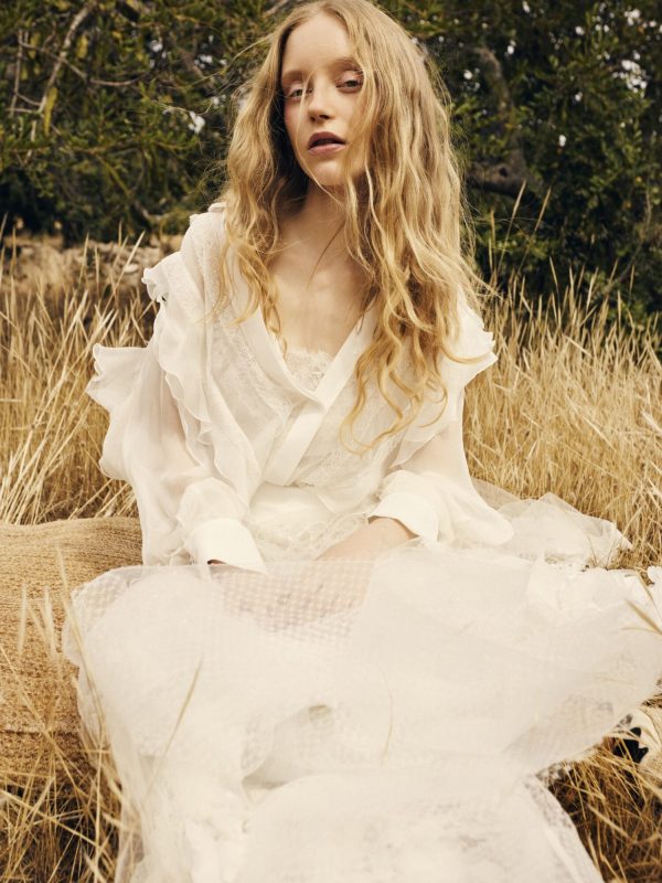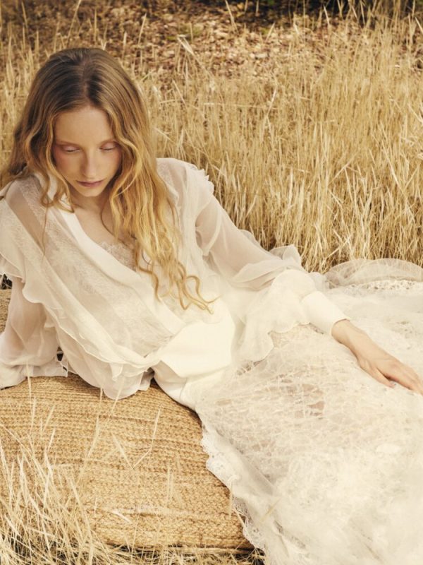 Conjunto boho de dos piezas con falda de cadera baja y bolsillos. Mix de texturas en red y flores. Camisa en muselina de seda con volantes y pasacintas estilo francés.